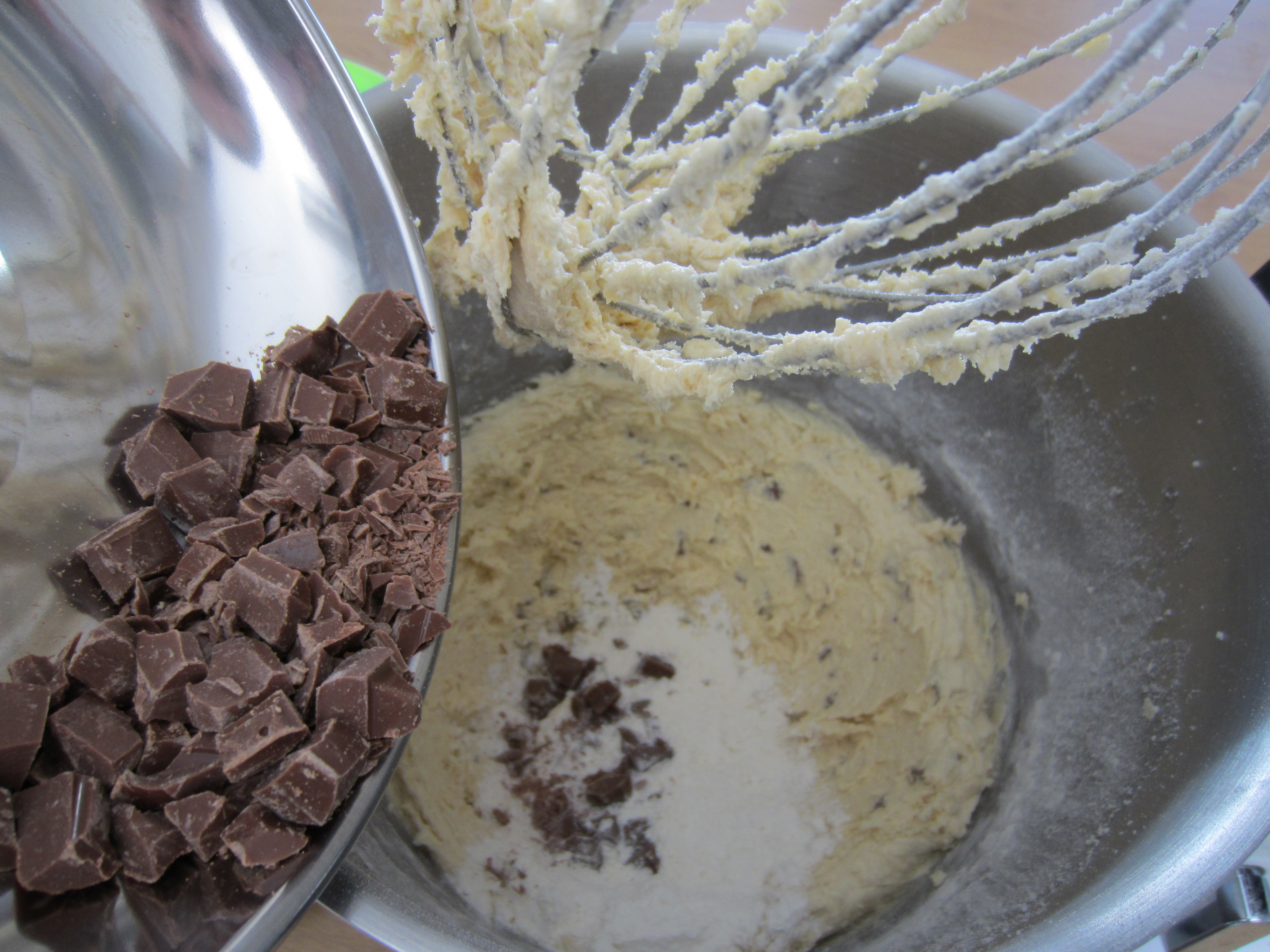 - In a separate bowl mix the flour, salt and bicarb. Slowly add to wet ingredients along with chocolate chips until just combined.