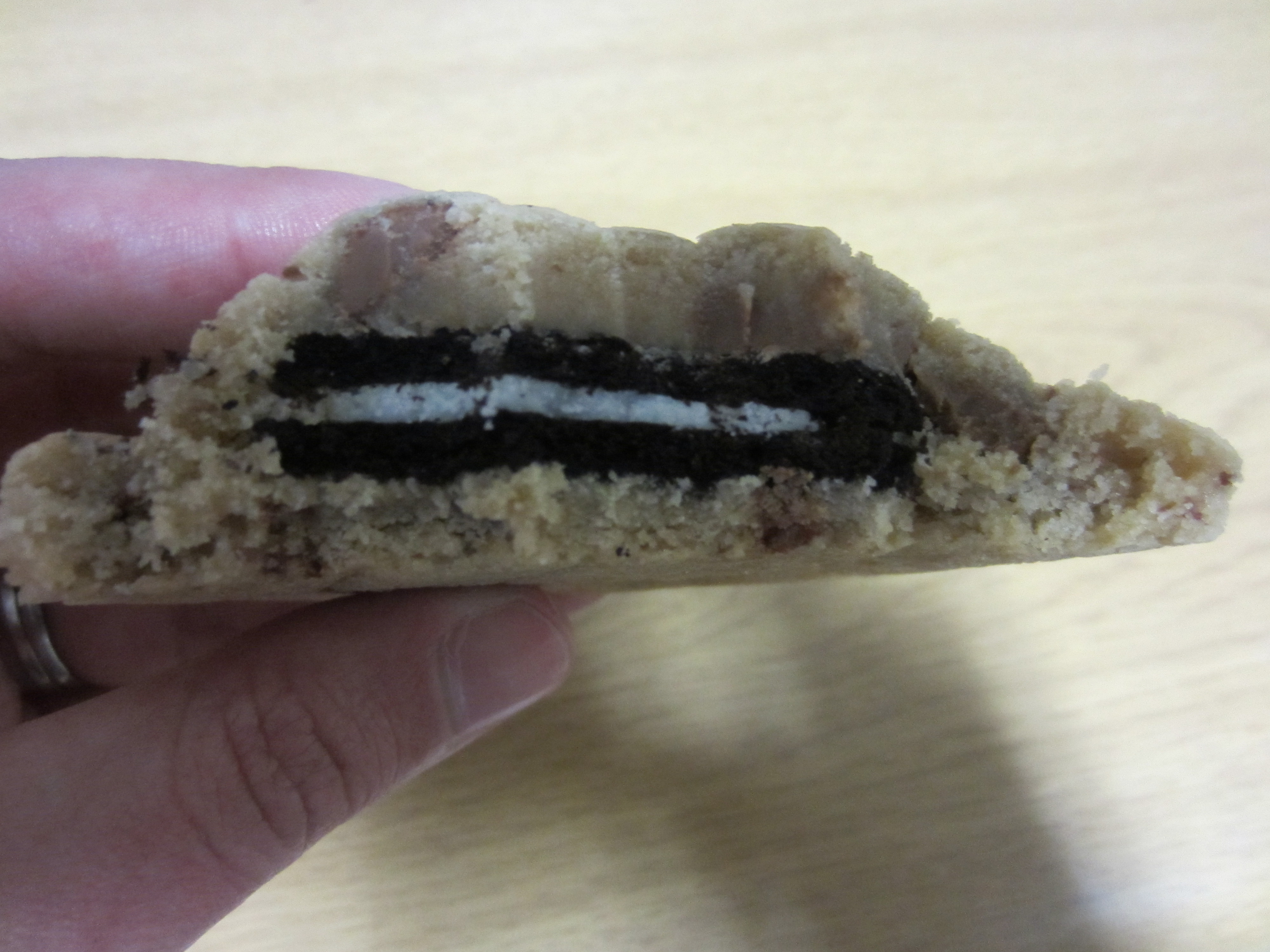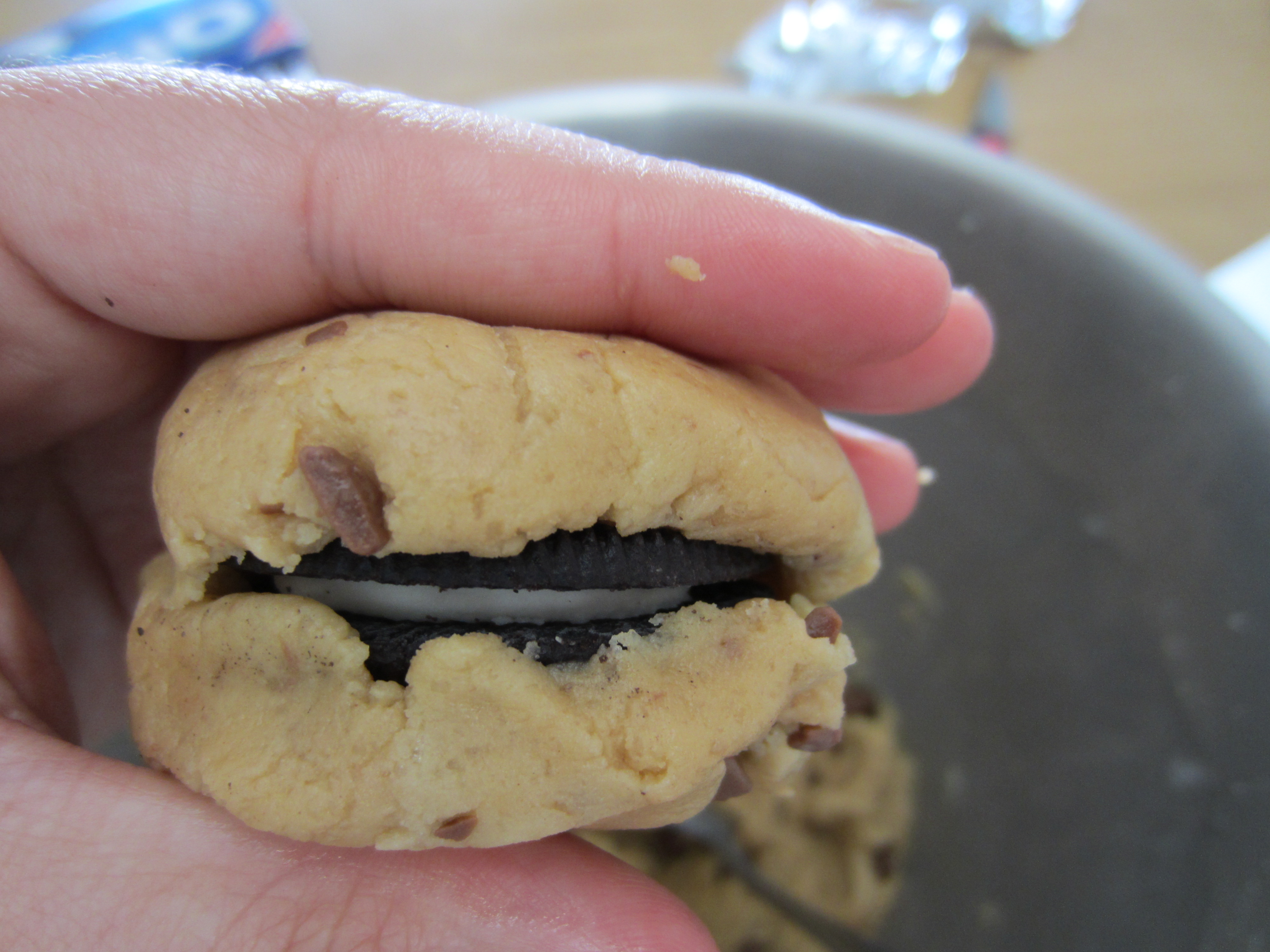 - Take one scoop of cookie dough and place on top of an Oreo Cookie. Take another scoop of dough and place on bottom of Oreo Cookie. Seal edges together by pressing and cupping in hand until Oreo Cookie is enclosed with dough.