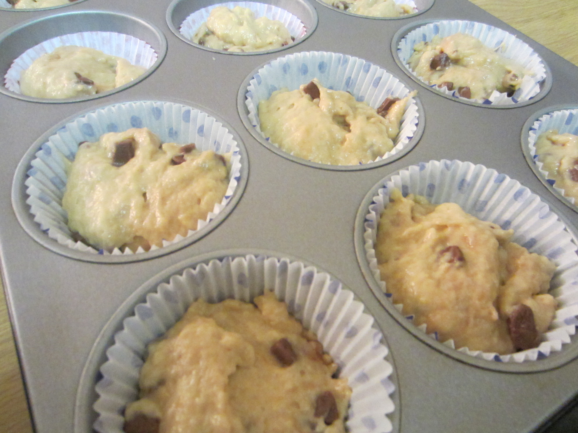 4. Combine the two mixtures and mix thoroughly. Fill 3/4 of the muffin holders with the batter