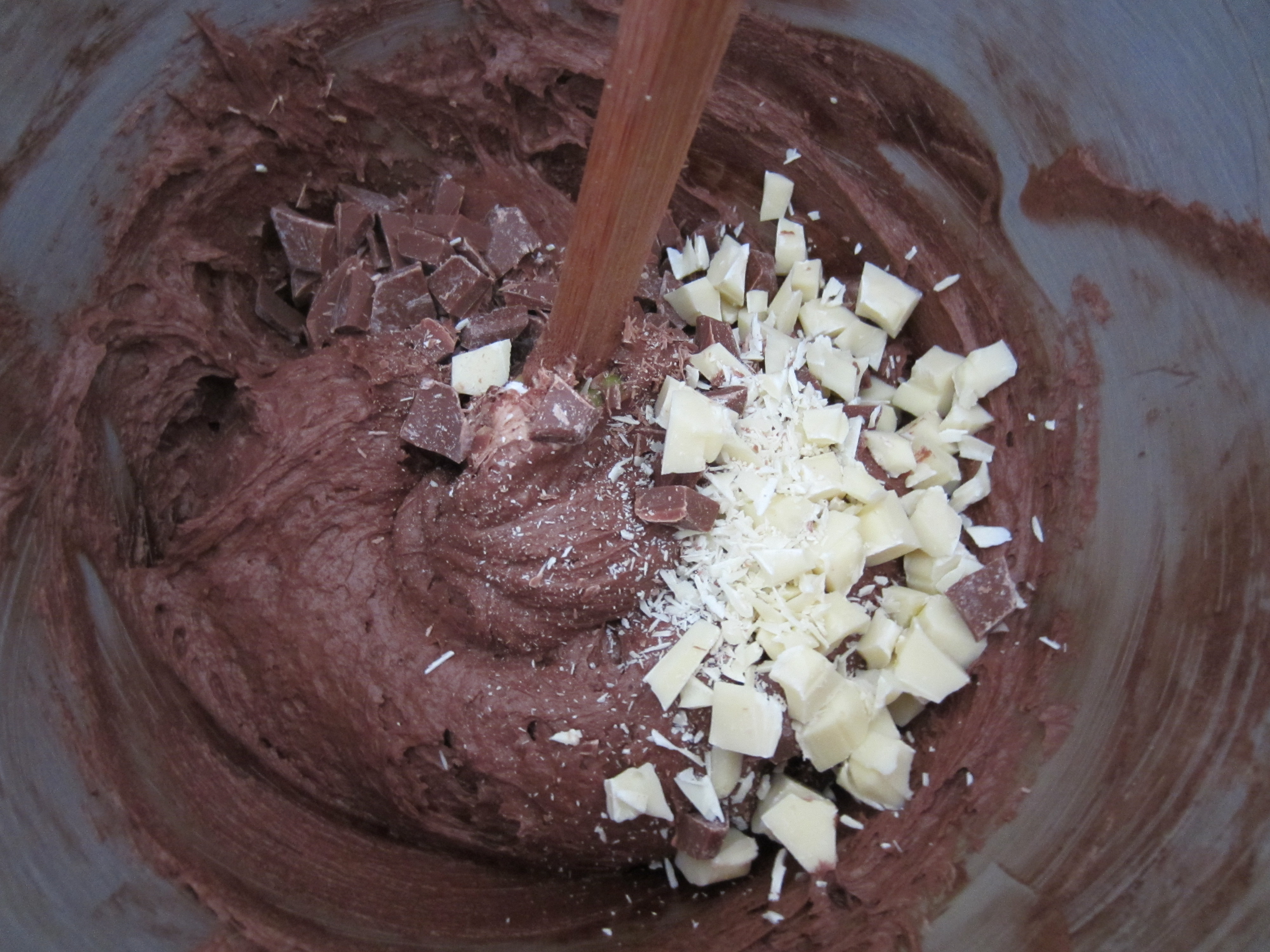 4. Beat the sugar and butter together until it is pale and fluffy. Add the eggs one at a time, together with a tablespoon of the dry ingredients. Beat in the melted chocolate, and then fold in the remaining dry ingredients and the chopped chocolate pieces. This is the opportunity to get creative and add nuts, more chocolate, etc.